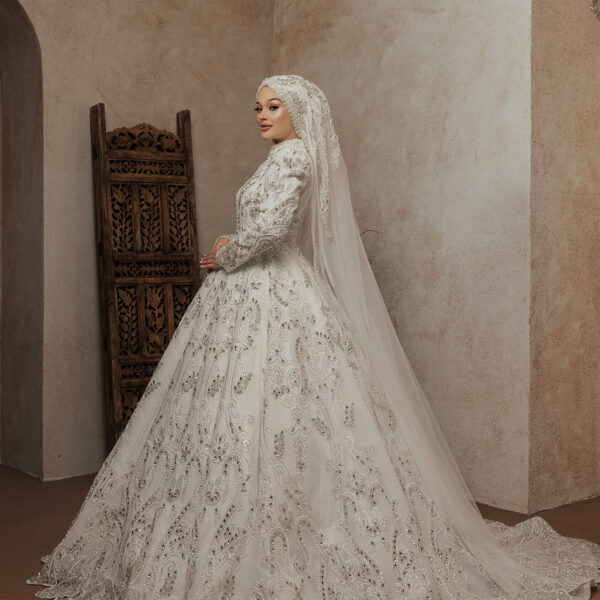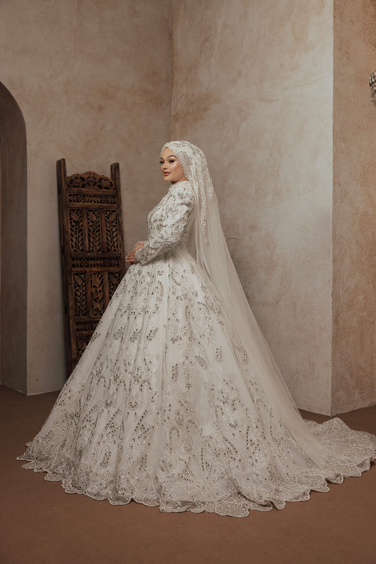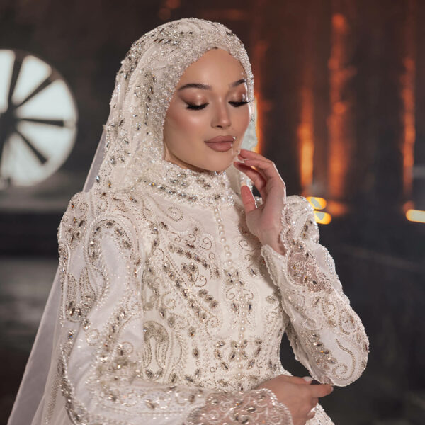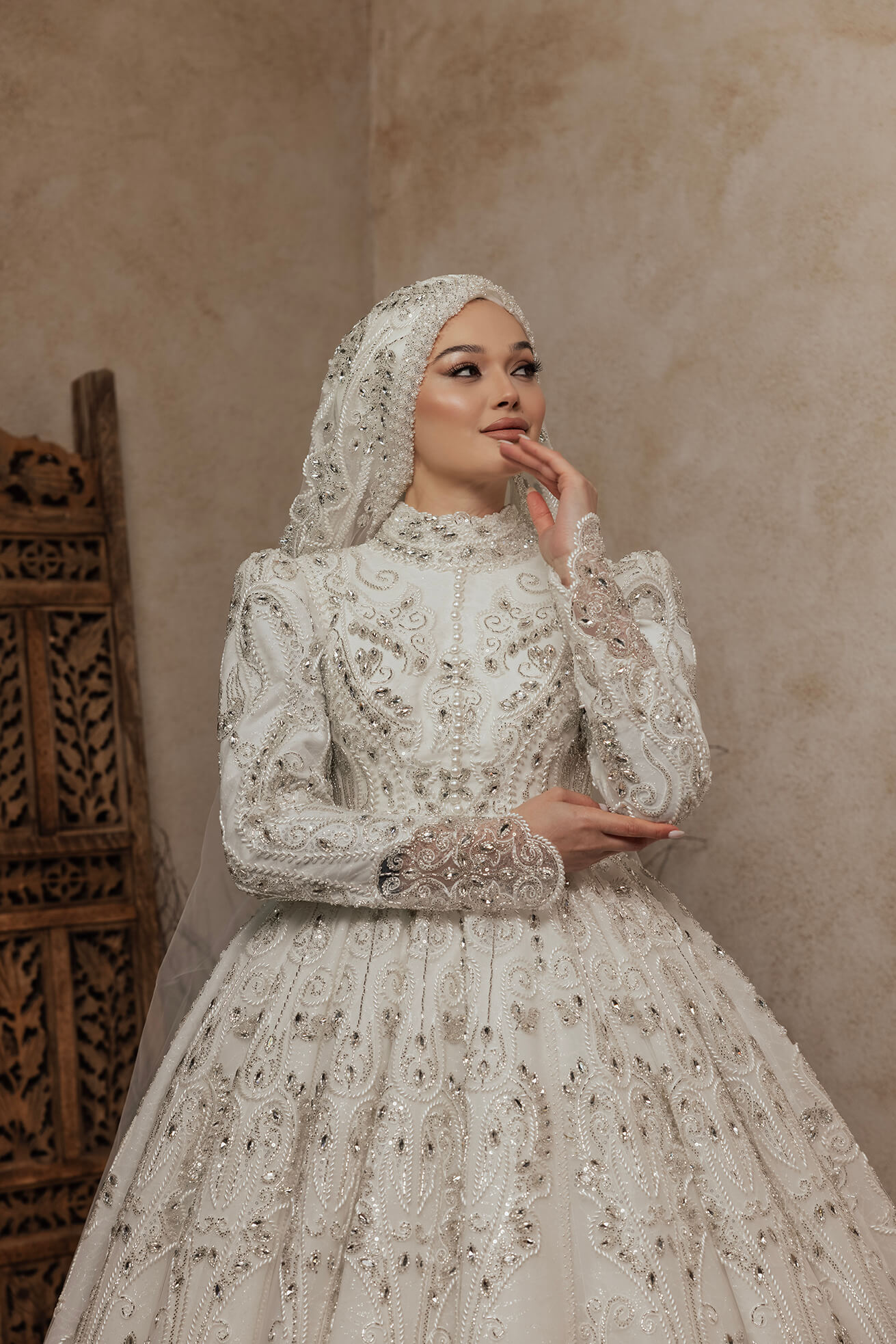 Modern çizgilerle tasarlanan tesettür gelinlik modelleri, ince işçilik, kaliteli kumaş ve kusursuz kalıp yapısıyla her gelinin hayalindeki silüeti ortaya çıkarır.