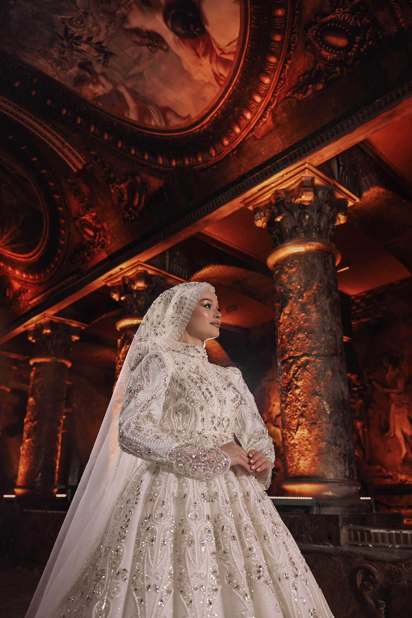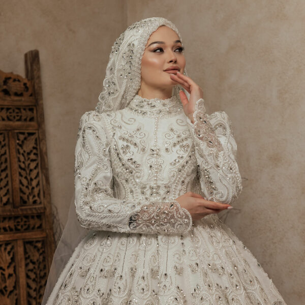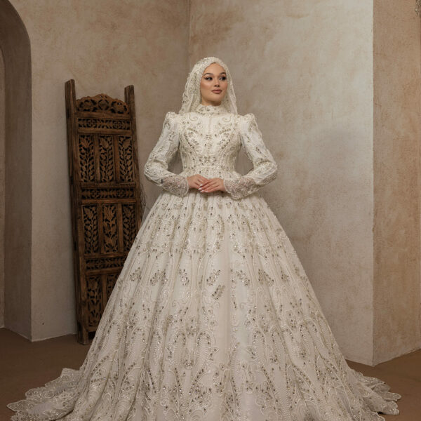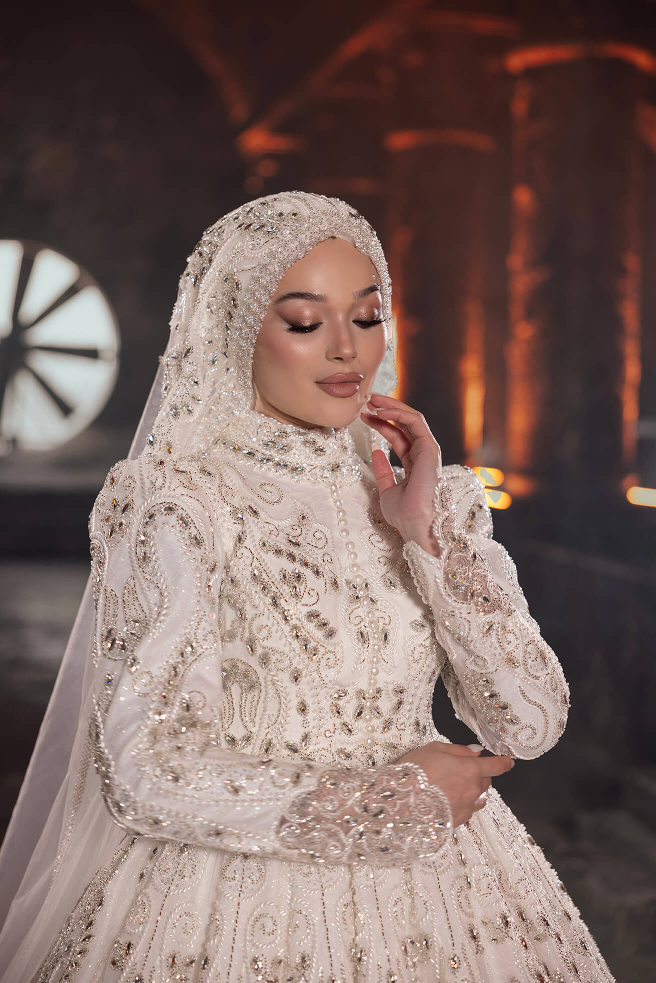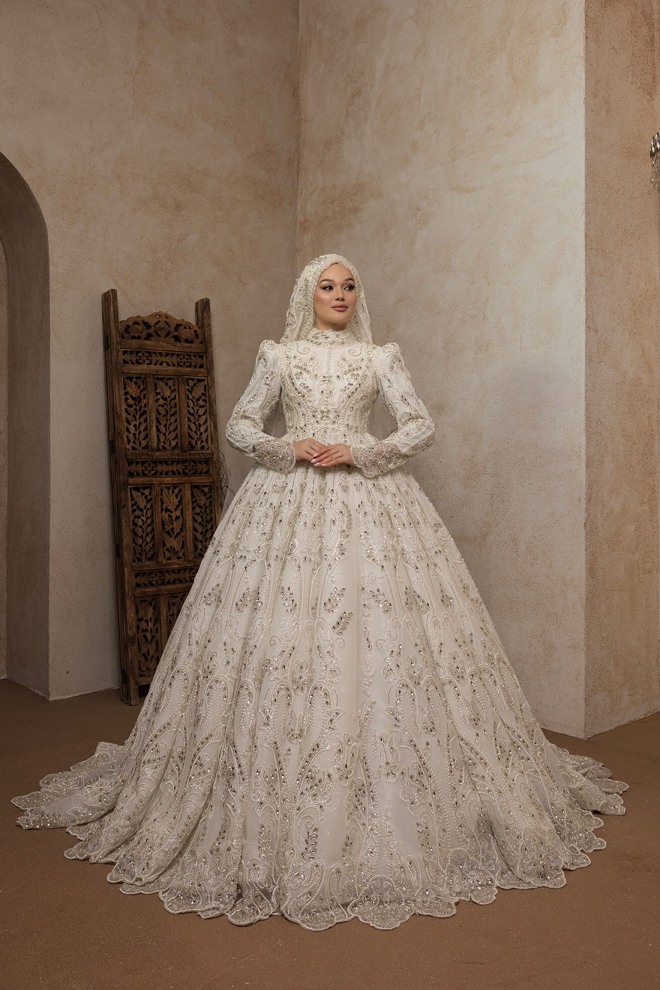 Modern çizgilerle tasarlanan tesettür gelinlik modelleri, ince işçilik, kaliteli kumaş ve kusursuz kalıp yapısıyla her gelinin hayalindeki silüeti ortaya çıkarır.