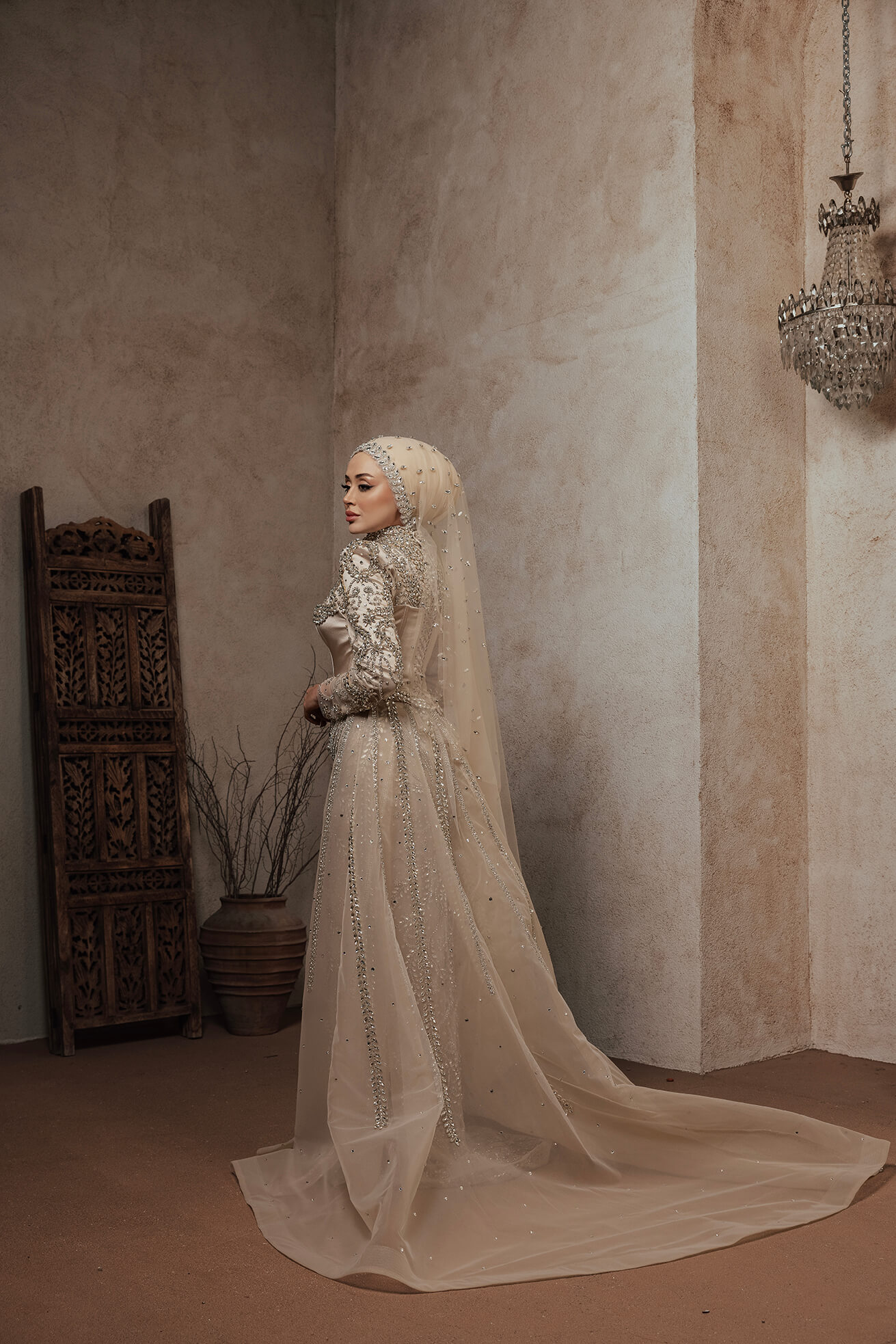 Omuzlardan süzülen tül detayları,